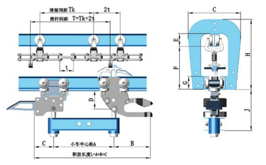 ZHZWJ4、ZHZWJ6積放式輸送機(jī)系統(tǒng)承載軌到采用特制的單面翻邊高錳合金槽鋼,使積放小車導(dǎo)輪與軌道之間的接觸由原來的線接觸變?yōu)槊娼佑|,提高了系統(tǒng)運(yùn)行的穩(wěn)定性和可靠性。新型的前小車采用獨(dú)特的設(shè)計(jì),將升降爪和止逸爪有機(jī)的結(jié)合為一體,簡(jiǎn)化了整體結(jié)構(gòu),保證了升降爪垂直升降的靈活性和可靠性。前鏟和尾鏟設(shè)計(jì)新穎,使系統(tǒng)的積放平穩(wěn)、精確。道岔采用全新的設(shè)計(jì),拋棄了原來的傳遞方式,使各種道岔完全形成標(biāo)準(zhǔn)化系列,簡(jiǎn)化了線路設(shè)計(jì)程序。